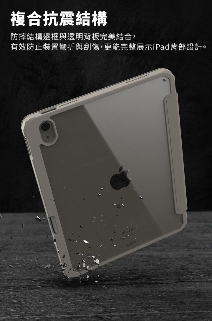 ● 防摔結構邊框與透明背板,有效防止iPad彎折與刮傷。