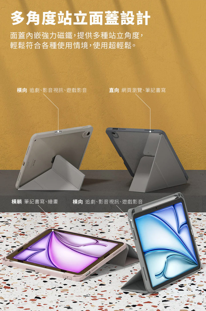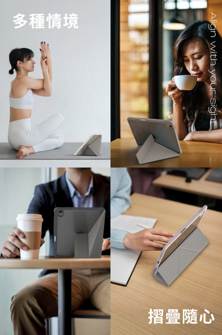 ● 多角度站立面蓋設計,適用於各種iPad使用情境。